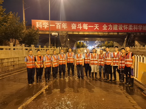 19时30分,区住建委传达防汛排涝应急抢险救援命令:“万星市场铁路桥涵下,积水十分严重,行人车辆都无法通过,给市民造成不便和危险。抢险队需前往抽干积水、清除淤积杂物。”接到命令后,集团公司立即响应区住建委号召,迅速启动“防汛应急预案”,由集团公司副总经理、总工程师陈劲亲自披挂上阵,全面部署极端天气下的应急处置工作。为确保当天抢险工作顺利开展,由集团公司承建的101中学怀柔校区扩建项目应急抢险队立即进入备战状态。项目经理、抢险队队长张二祥快速组织13名防汛值班队员将防汛物资、设备装车,第一时间奔赴抢险点,按预案分工有条不紊进行设备安装积水抽排。经过一个半小时的艰辛努力,万星市场铁路桥涵下终于恢复原貌,市民和车辆顺利通行,抢险队顺利圆满完成了应急抢险救援任务,得到了广大市民和区住建委的一致好评。